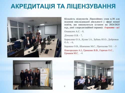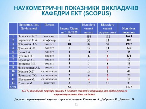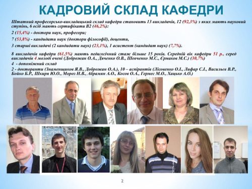 Кадровий потенціал. Кафедра має стабільний склад науково-педагогічних працівників, серед яких професори – 2 особи (15%), доценти – 7 (54%), старші викладачі – 3 (23%), асистент – 1 (8%). Частка молодих вчених у складі кафедри становить 31%. За останні 5 років у склад кафедри прийнято 2 випускники аспірантури, доктори філософії (Шевченко М.С., Єрмаков М.С.), два викладача кафедри, молоді вчені отримали звання доцента (Доброжан О.А., Д’яченко О.В.). 46% викладацького складу кафедри мають сертифікати, що підтверджують рівень володіння іноземною мовою B2. Наразі всі викладачі кафедри за своїми здобутками відповідають п. 38 Ліцензійних умов.