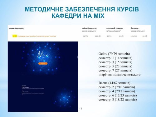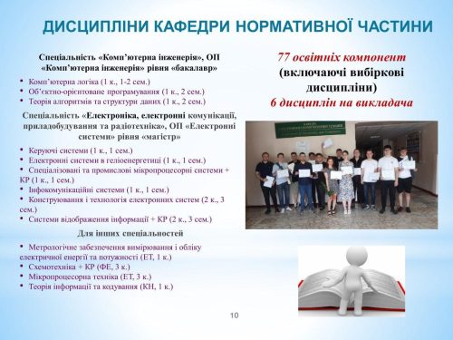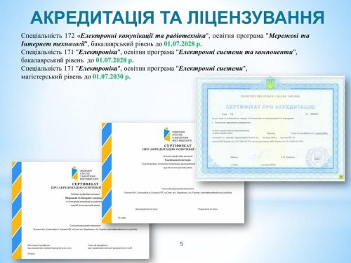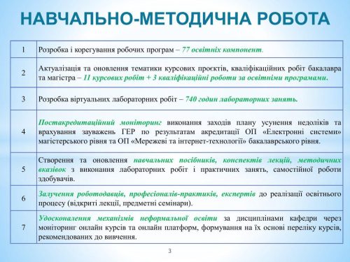Навчально-методична робота. Кафедра електроніки і комп’ютерної техніки успішно забезпечує реалізацію освітніх програм зі спеціальностей G5 «Електроніка, електронні комунікації, приладобудування та радіотехніка» (колишні 171 та 172) та F7 «Комп’ютерна інженерія» на бакалаврському і магістерському рівнях , що підтверджується сертифікатами акредитації: