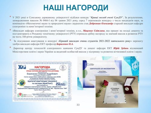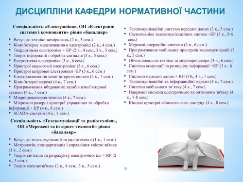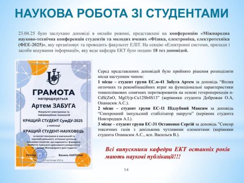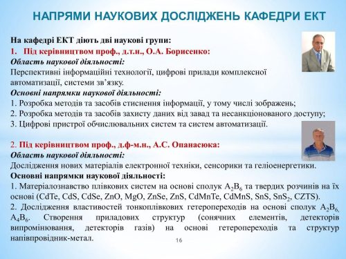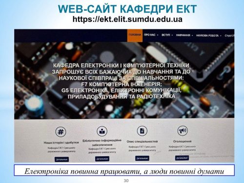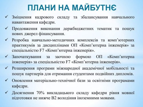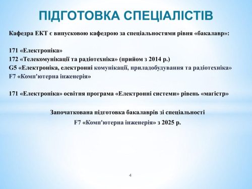 Таким чином, кафедра електроніки і комп’ютерної техніки поєднує класичні університетські підходи до підготовки високо конкурентоздатного випускника з поєднанням інноваційних методів формування фахівців з електроніки, телекомунікацій та комп’ютерної інженерії, які мають ефективні практичні навички досліджувати, створювати та впроваджувати новітні електронні, інформаційні та комп’ютерні технології.