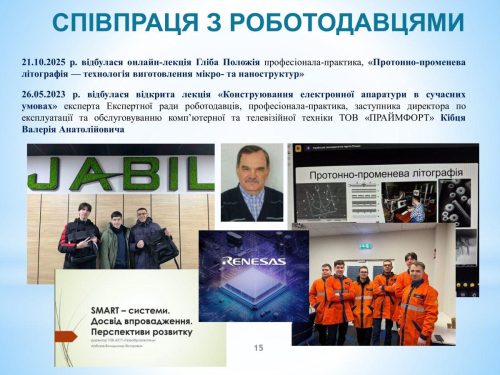 Кафедра послідовно розвиває співпрацю з підприємствами та ІТ-компаніями, зокрема через проведення лекцій представниками ІПФ НАНУ, PortaOne, АТ «Укртелеком», ТОВ «Праймфорт», ТОВ «ЕСП «Преобразователь». У 2026 р. планується укладення угоди про співпрацю з компаніями Renesas Electronics та Jabil з можливістю проходження студентами виробничої та переддипломної практик на базі підприємств.