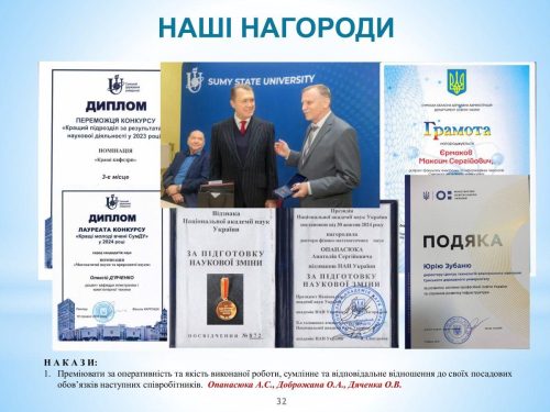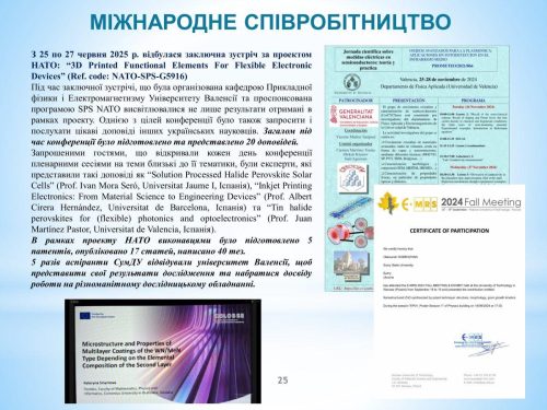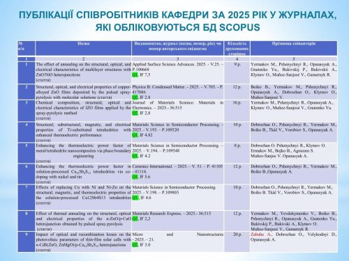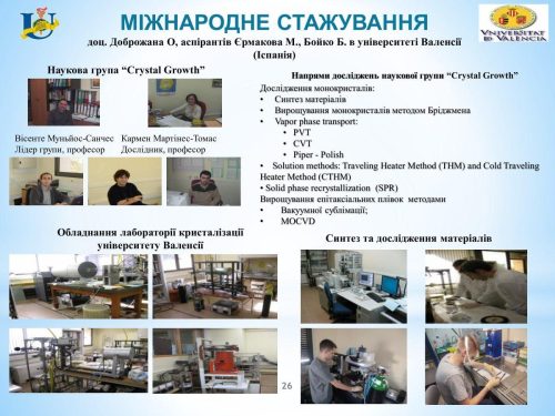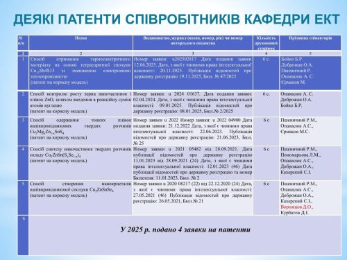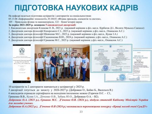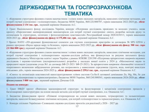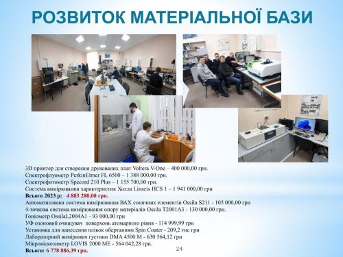 Матеріальна база кафедри. Суттєвий розвиток сучасної матеріальної бази кафедри та її наукових лабораторій став можливий завдяки науковим проектам НФДУ. За виділені кошти було закуплене високовартісне обладнання на загальну суму близько 7 млн грн. Серед придбаного 3D принтер для створення друкованих плат Voltera V-One, спектрофлуометр PerkinElmer FL 6500, спектрофотометр Specord 210 Plus, система вимірювання характеристик Холла Linseis HCS 1, автоматизована система вимірювання ВАХ сонячних елементів Ossila S211, тощо. Було також отримано 13 комплектів високопродуктивних комп’ютерів для нового комп’ютерного класу кафедри.