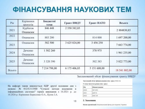 Наукова діяльність. Кафедра забезпечувала активну участь у виконанні держбюджетних НДР та грантових досліджень: