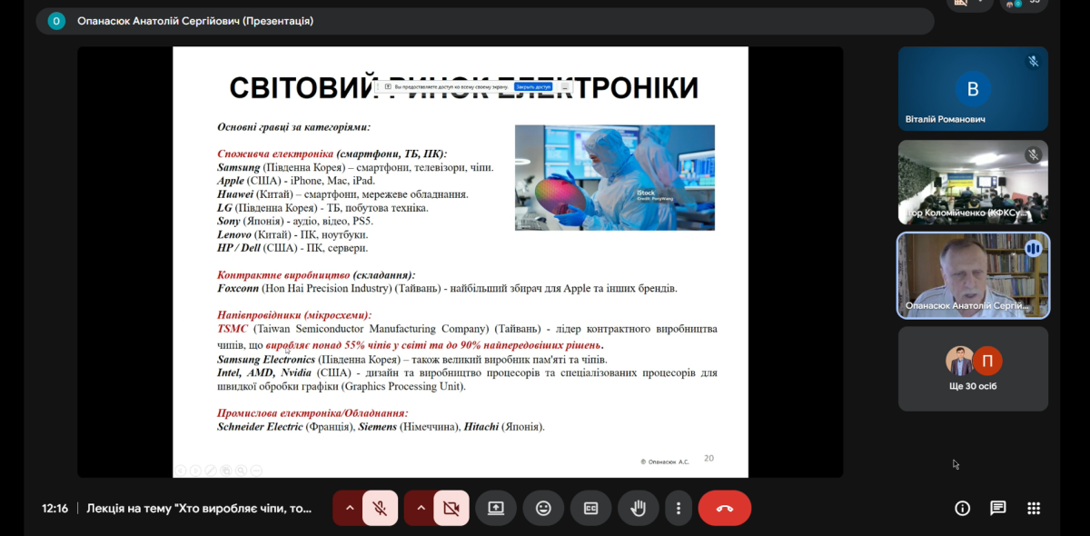 The lecturer emphasized that modern microelectronics is the foundation of the digital economy, and chip production effectively determines the technological leadership of states and corporations. The structure of the global semiconductor industry was discussed, including developers, material and equipment manufacturers, as well as IC design companies.